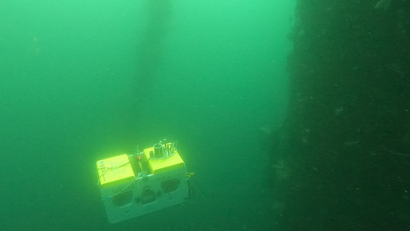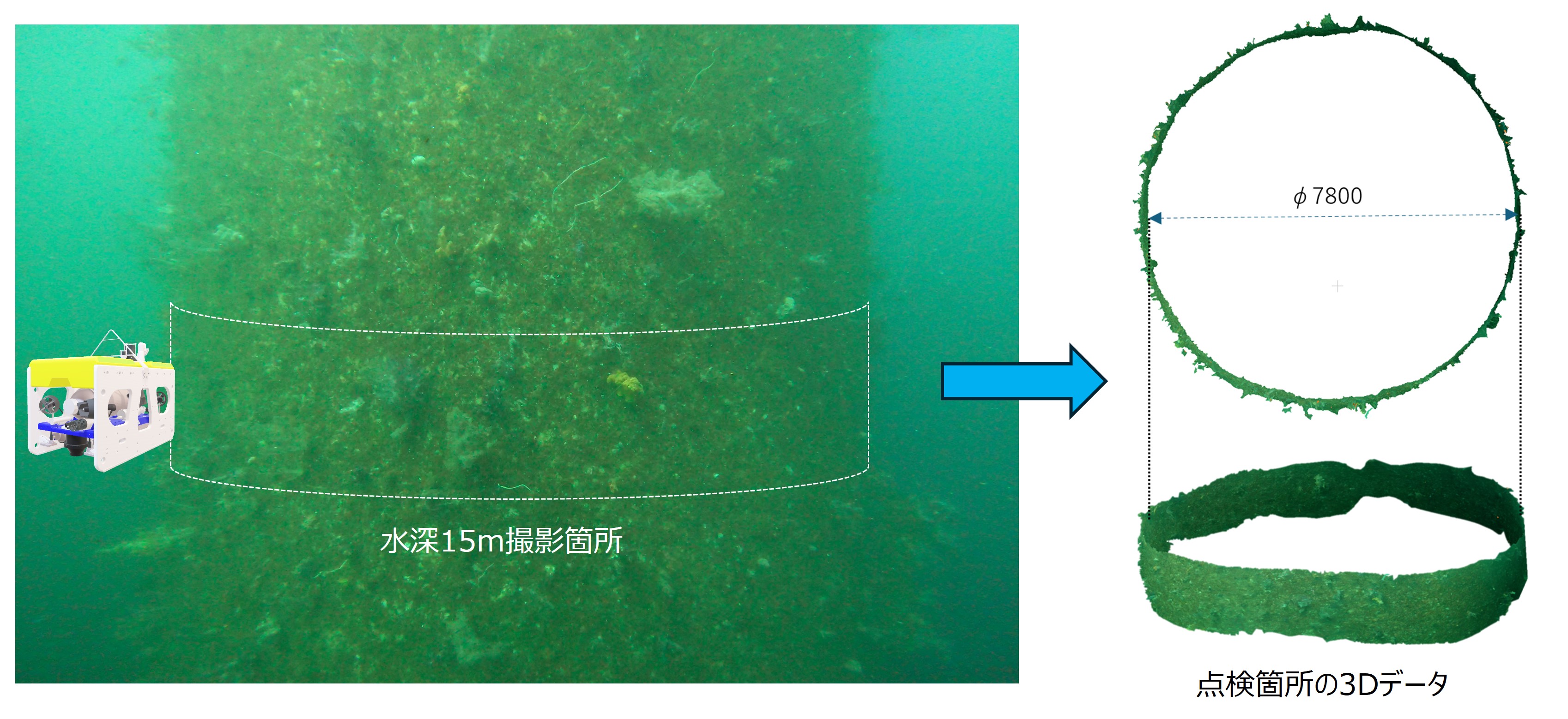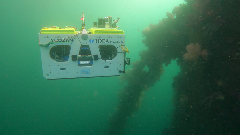 周回点検は、浮体を係留するため3方向に設置された、係留チェーン接続部の水深5m~7m付近で(写真2参照)、係留チェーン接続部や係留チェーン等の障害物を自律で回避しながら(写真3参照)、2周半程度周回して撮影を行いました。更に水深15m付近で、3方向に展張した係留チェーンの内側を周回して、撮影を行いました(写真4参照)。