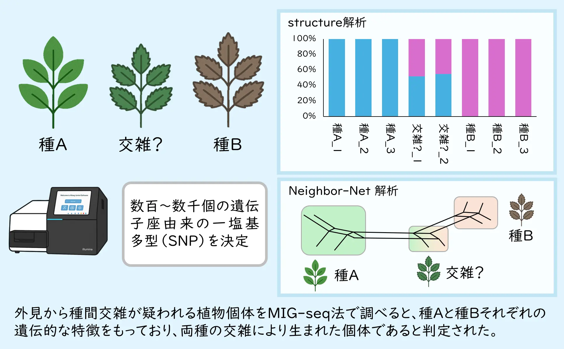 MIG-seq(Multiplexed ISSR Genotyping by Sequencing)法は、生物の個体・品種・集団・種間における遺伝的な違いを調べる手法です(Suyama & Matsuki, 2015)。