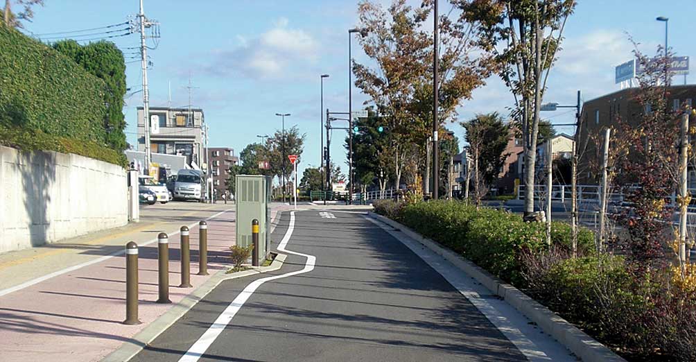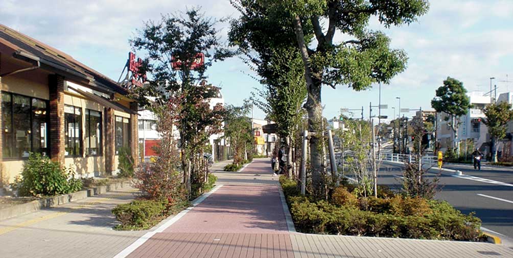 まずは住環境の課題について。環境施設帯の構成要素である植樹帯、歩行者通行帯、自転車通行帯、副道の組み合せや植樹する木の種類などについて、地域住民の方々から広く意見を募り、道路の幅員構成を決定しました。沿道乗入れの要望が多い地区は副道タイプ、緑化を希望する地区は緑地タイプを基本に整備しました。緑地タイプの横断構成は、歩行者の安全性に対する地域住民の意識が高く、自転車と歩行者を植樹帯で物理的に分離する構造を採用しました。