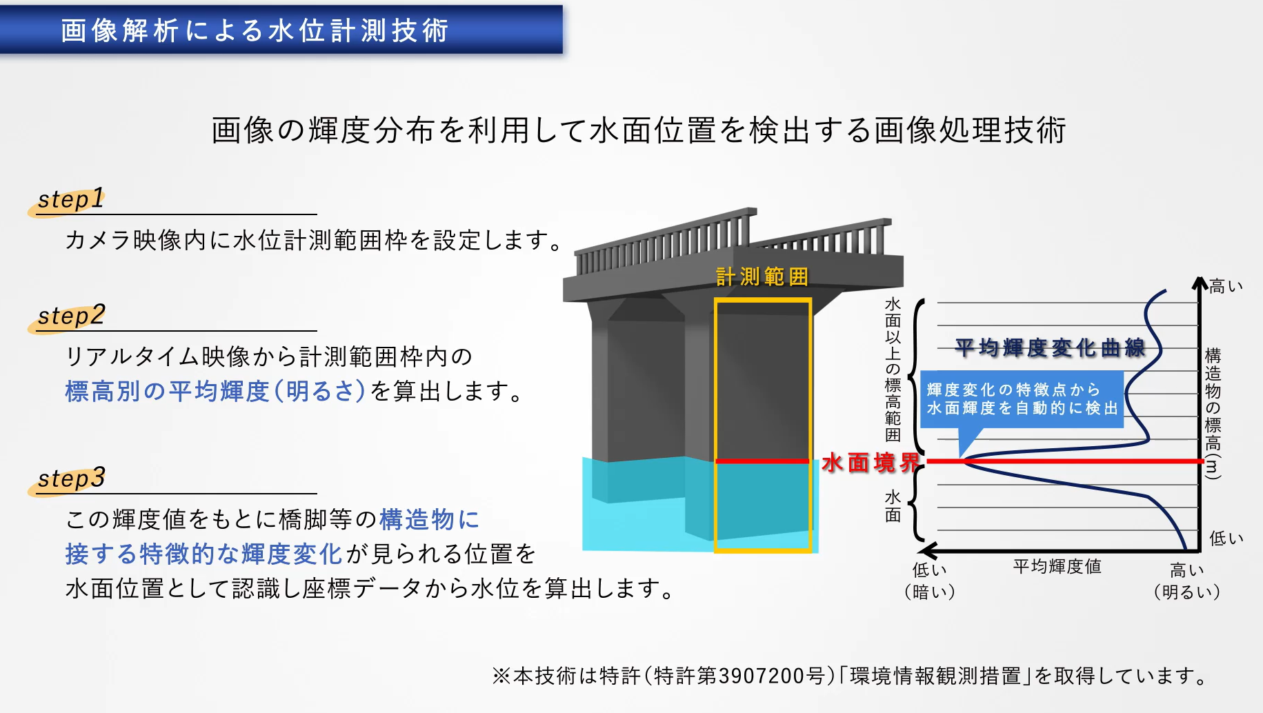 その仕組みは次のようなものです。まず橋脚や護岸などに特徴的な輝度変化(明るさの変化)が現れる位置を水面として自動判別し、画像から水位を自動計測します(水位計測手法は特許取得(*2)済み)。