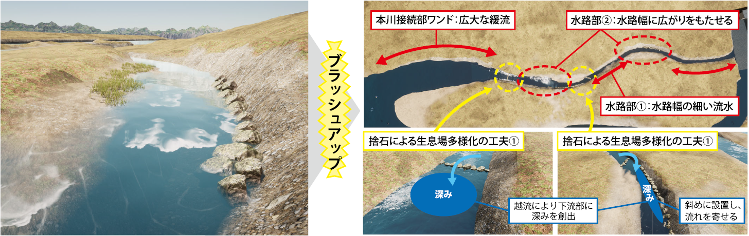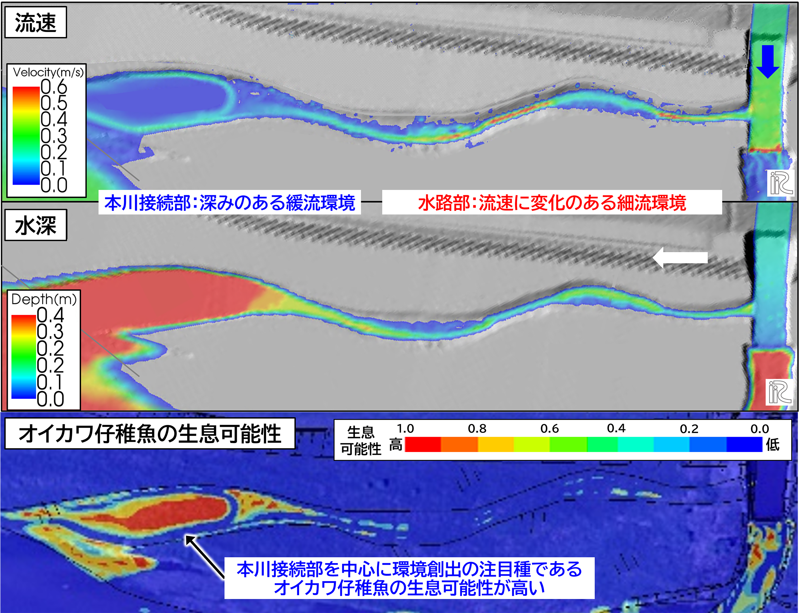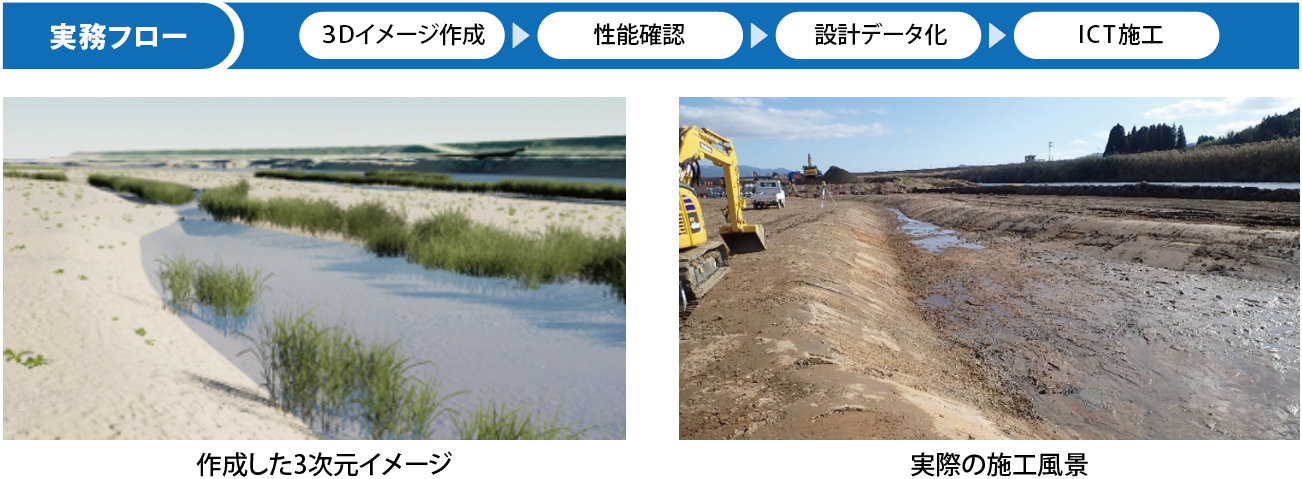 3次元イメージをもとに整備箇所の河川環境3次元データを作成し、外部の3次元設計ツール(iRIC)による評価を反映し、整備効果を具体的かつ定量的に表現できます。